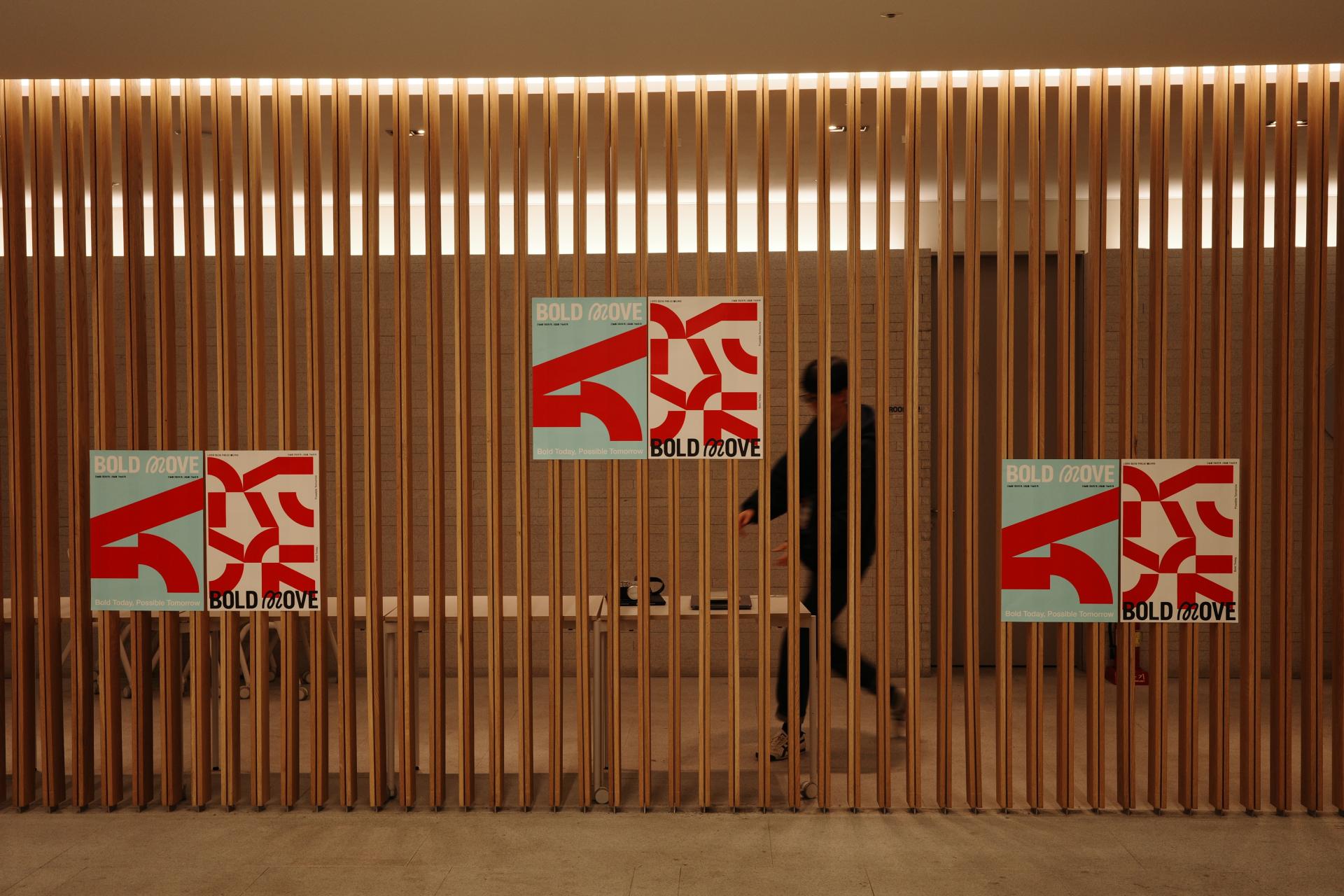 긴 창살 파티션 위에 붉은색 디자인의 볼드 무브 포스터가 붙어 있고, 그 뒤로 남성 한 명이 지나가고 있다.