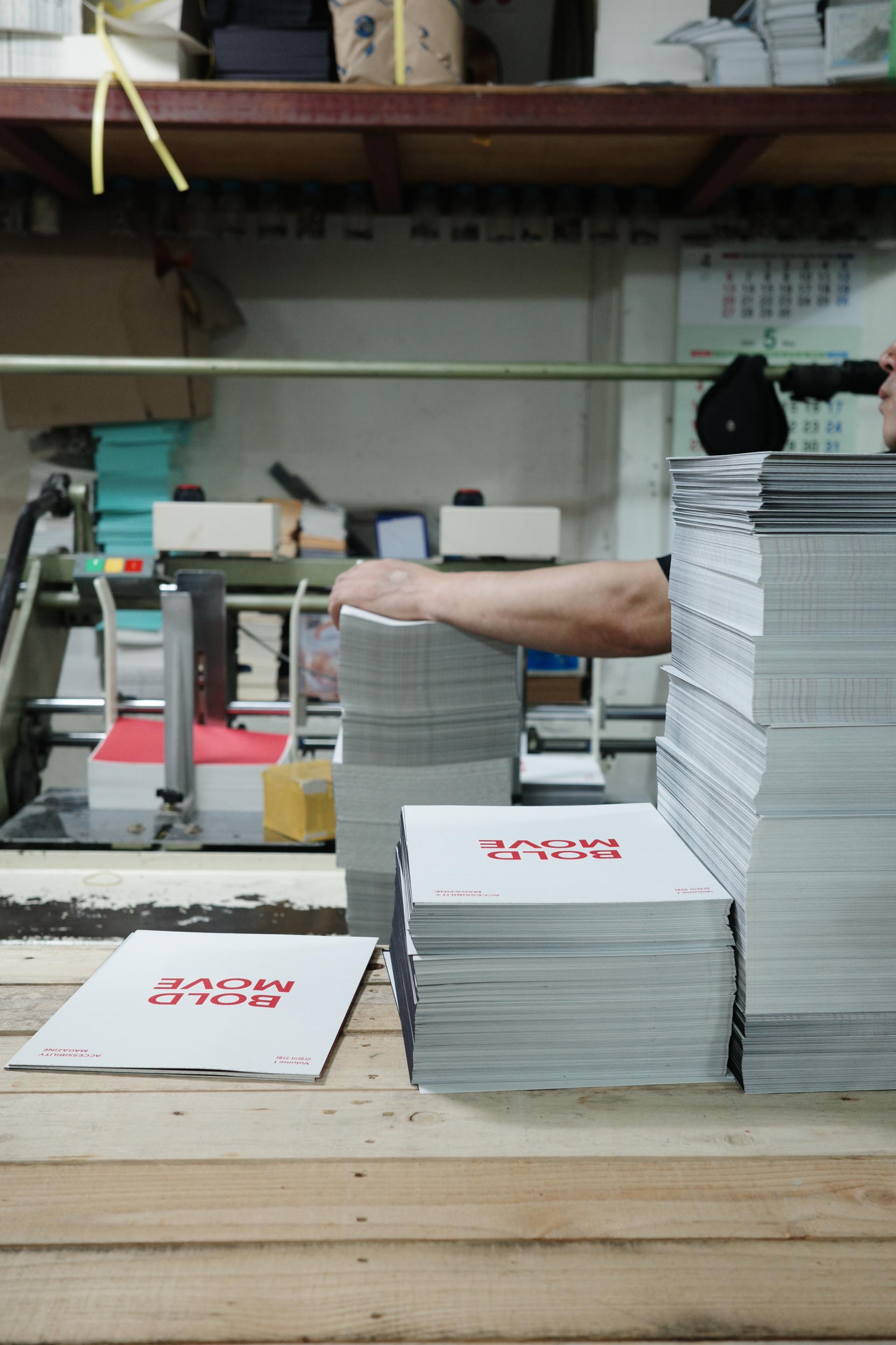 인쇄소 작업대, BOLD MOVE라고 적인 표지 더미 위에 한 남성이 왼손을 올리며 작업하고 있다.