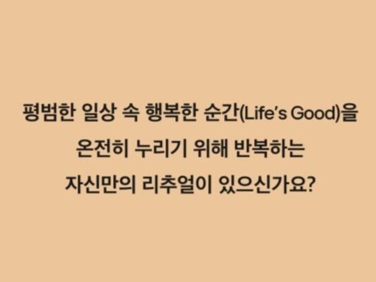 다양한 기획자, 크리에이터, 자신만의 기업과 브랜드를 운영하는 오피니언 리더들에게 질문을 드렸습니다. 평범한 일상 속 행복한 순간(Life's Good)을 온전히 누리기 위해 반복하는 자신만의 리추얼이 있는지, 더 나은 삶을 만드는 각자의 하루를 소개해달라고요. 조금 더 나은 무언가를 위해 누구보다 치열한 삶을 사는 그들의 답에 어쩌면 약간의 힌트가 있지 않을까 하는 기대와 함께 취재를 해봤습니다.