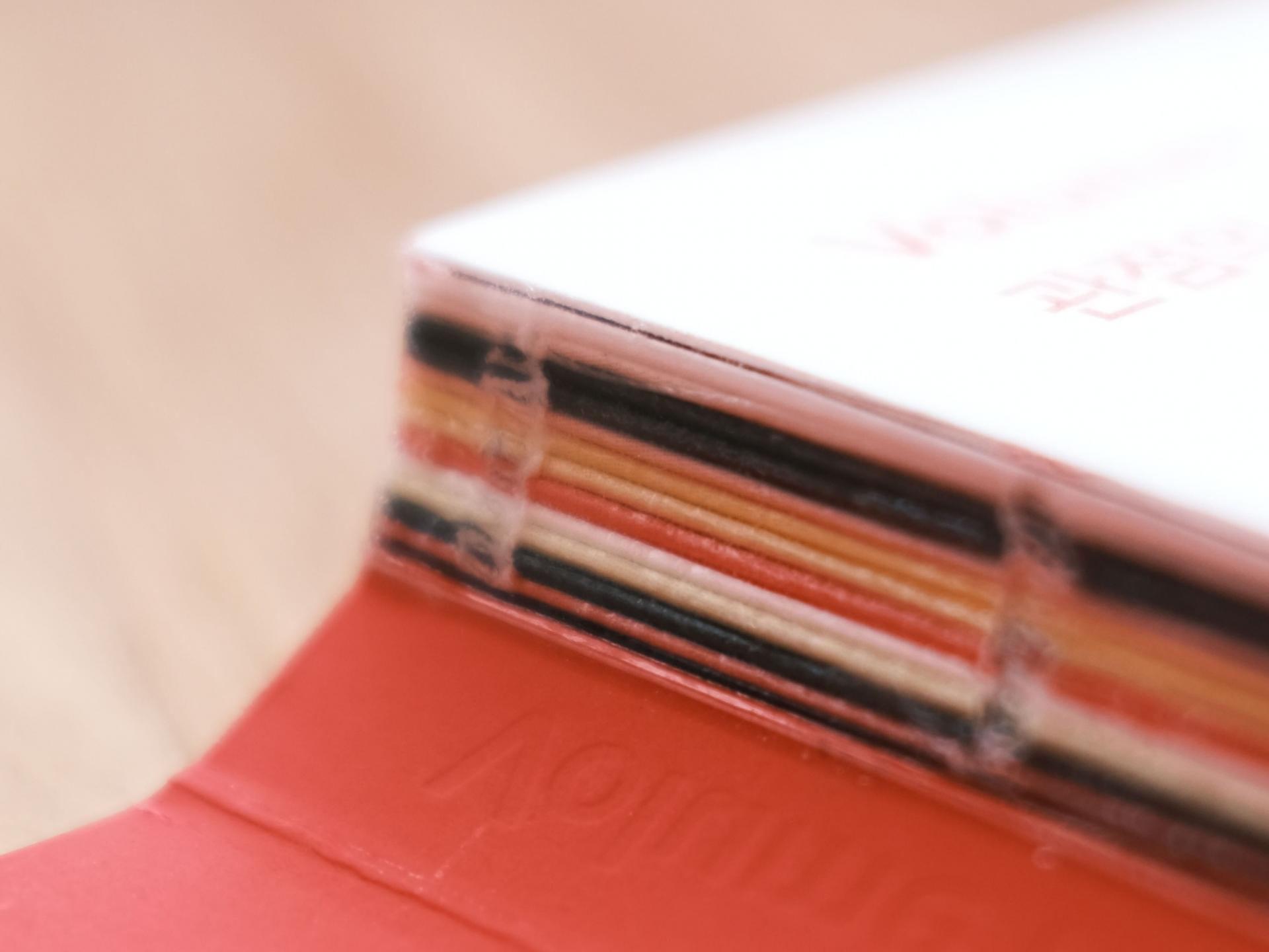 한 권의 책을 엮은 책등 안에 쌓여있는 다채로운 종이들의 측면을 가까이에서 찍은 사진으로, 흰색과 검은색, 빨간색, 주황색, 노란색, 베이지색 등 다양한 색상의 종이들이 쌓이며 층을 이루고 있다.