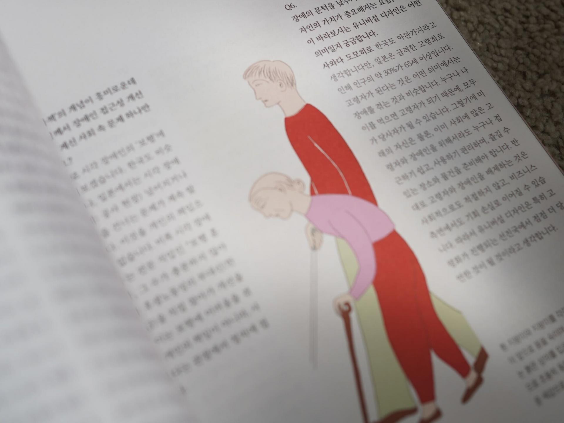 흑백 텍스트와 그림이 인쇄된 페이지가 펼쳐진 책이 회색 러그 위에 놓여 있다. 오른쪽 페이지에는 왼쪽 손으로 갈색 지팡이를 짚고 걷는 할머니가 흰색 지팡이를 들고 있는 시각 장애인 남성의 손을 잡고 함께 앞으로 나아가는 키미 작가님의 일러스트가 그려져 있다.